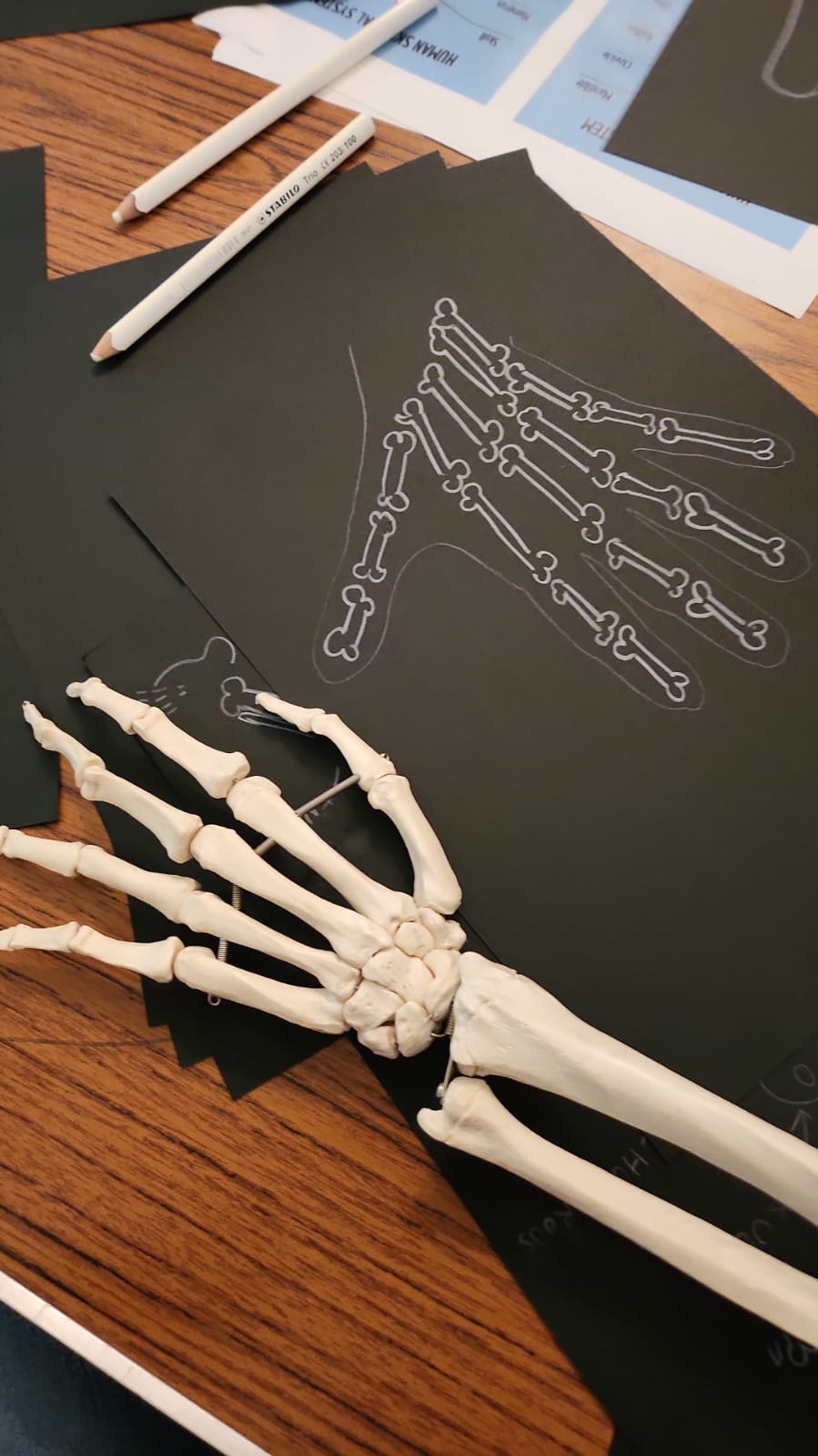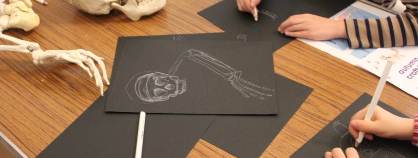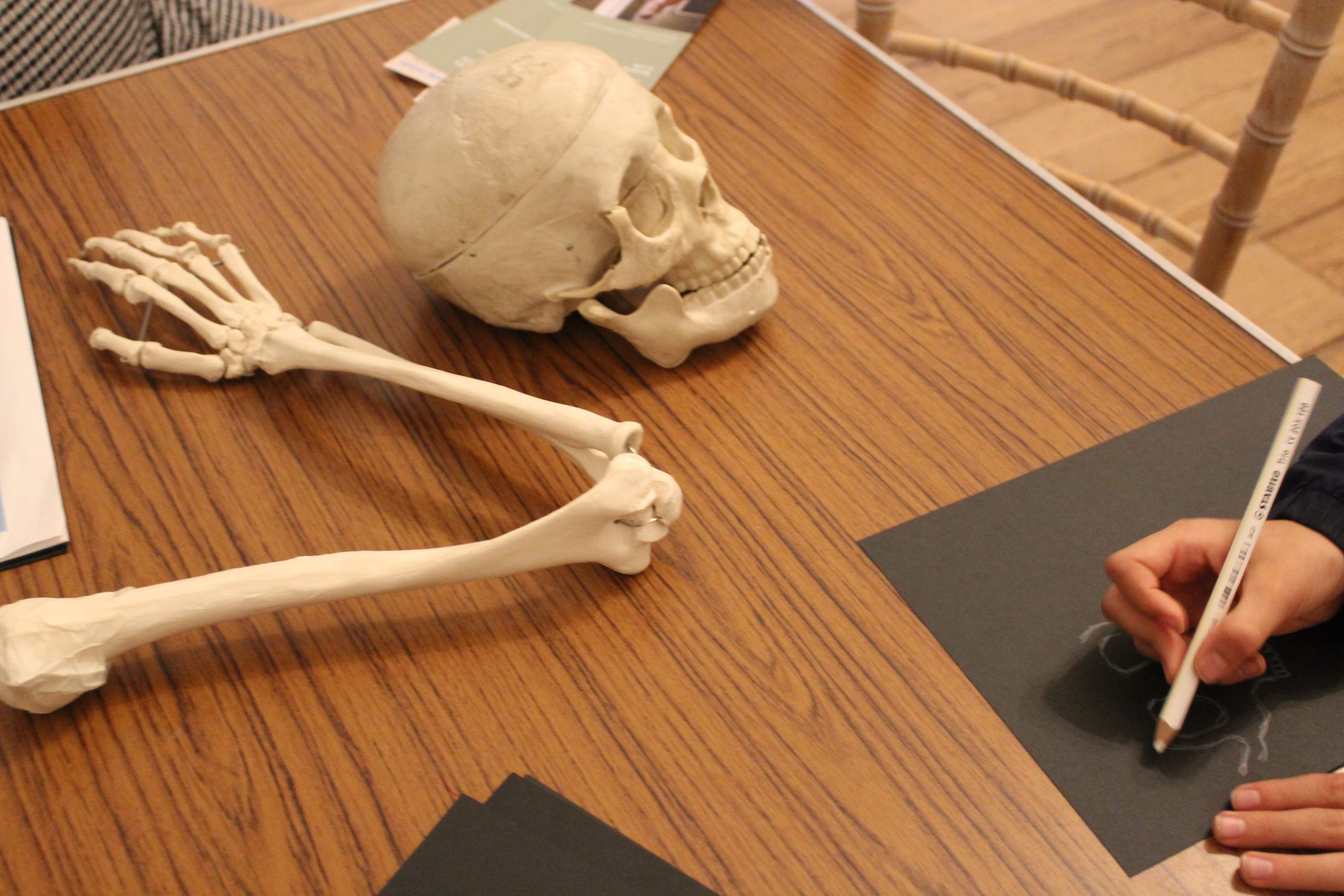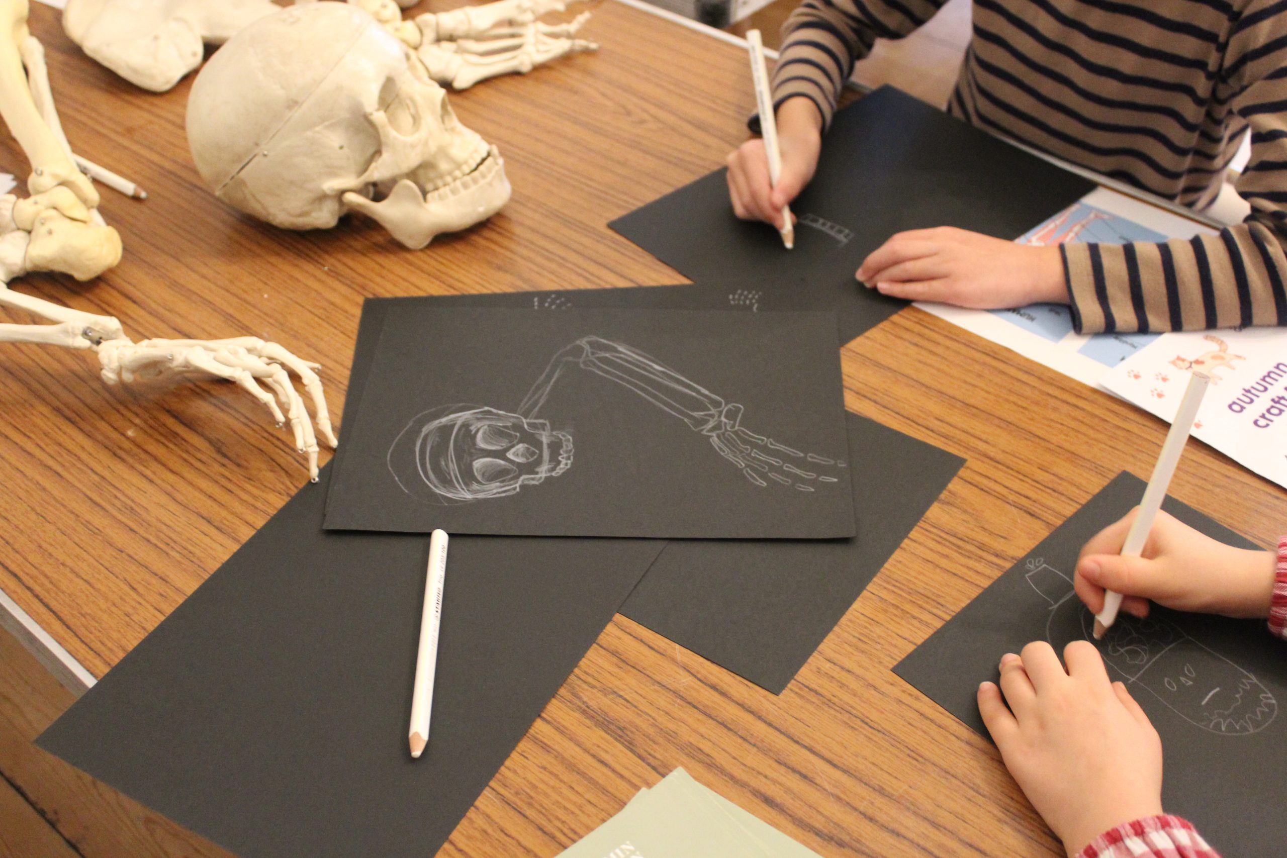 Children sketched skeletons, handled replica bones, and practised identifying each bone using its correct anatomical name. Many took their time in careful “life-drawing” studies, examining the structure and details of ribs, femurs, skulls and vertebrae with impressive concentration!